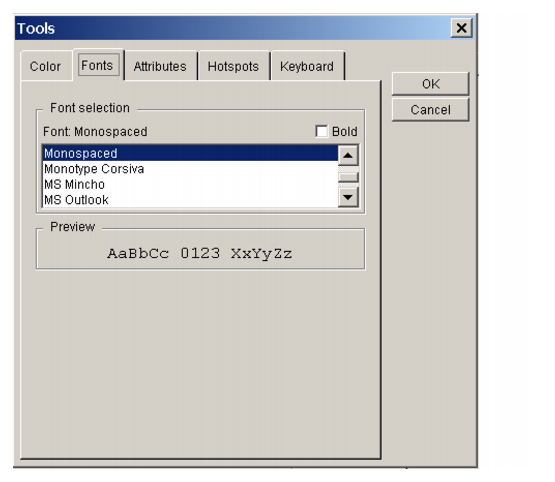 The Fonts tab enables you to customize the host fonts used to display text in your sessions. Any changes you make to the host fonts are applied only to the selected session. Newly-created sessions always use the default fonts and mappings.